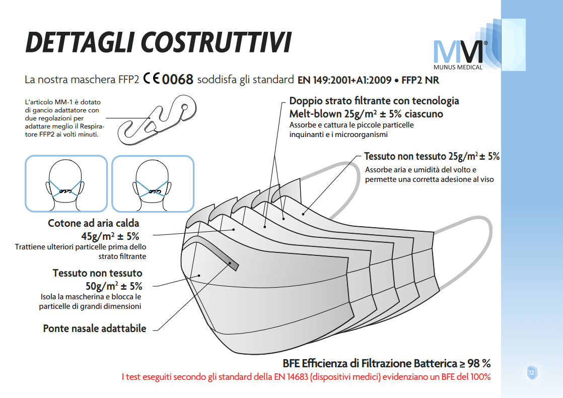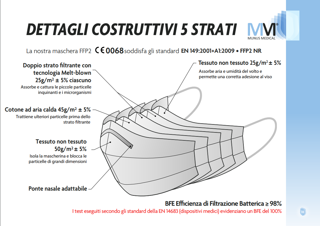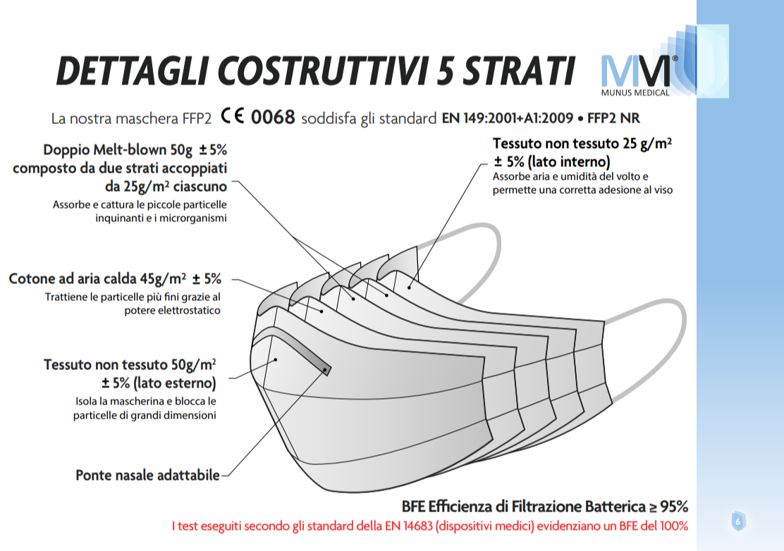 Il respiratore FFP2 NR modello MM-4 è un Dispositivo di Protezione Individuale di Classe III e, come previsto dalle normative, la nostra società gestisce apposito fascicolo tecnico nel rispetto di tutte le direttive europee e degli obblighi per una regolare marcatura CE. Ai seguenti link, LINK 5 STRATI, è possibile scaricare Dichiarazioni di Conformità e manuali d’uso.