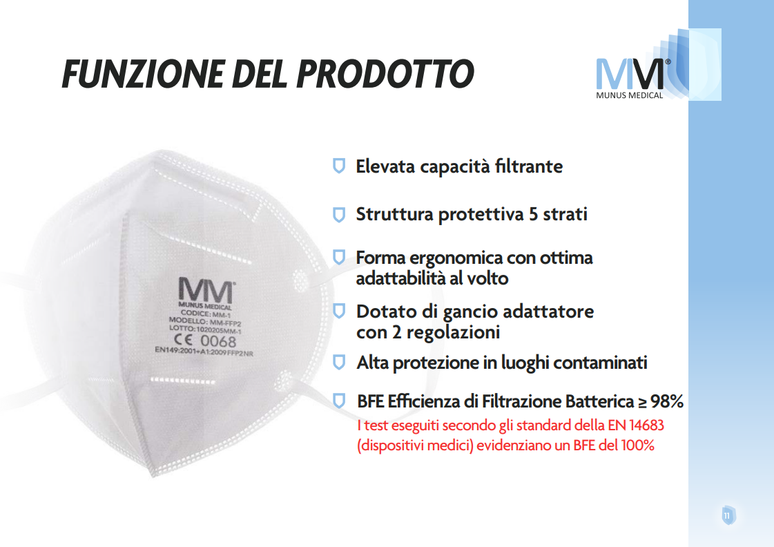I Dispositivi Medici oggetto di questa presentazione sono mascherine non sterili in 3 strati, prive di lattice, anatomiche, destinate a essere indossate dagli operatori sanitari durante un’attività medica o altre attività in ambito sanitario o da altri utilizzatori, in altri ambienti, al fine di evitare la dispersione di agenti patogeni (quali ad esempio batteri o virus) dispersi in goccioline liquide (droplets) e aerosol che possono fuoriuscire dalla bocca e dal naso di chi le indossa.