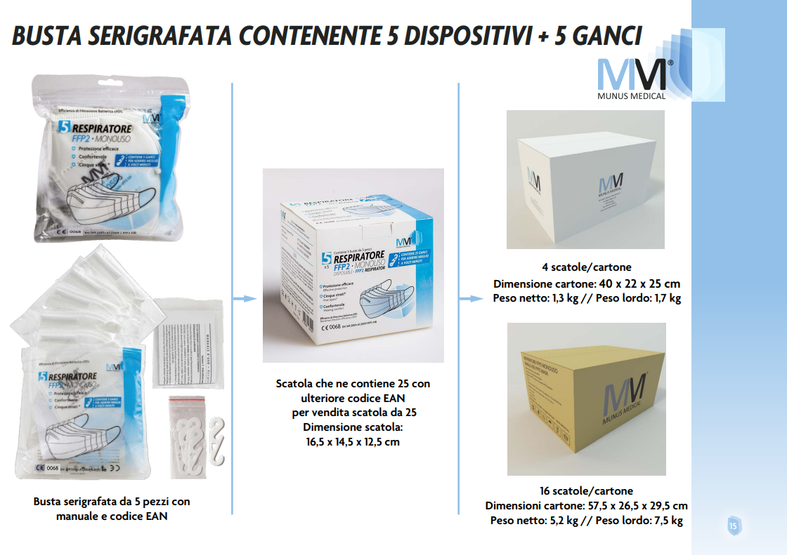 Ogni mascherina è unisex, in taglia unica e impacchettata in buste da 10 pezzi ciascuna contenente manuale d’uso sigillato in bustina che lo separa dai dispositivi in scatola serigrafata che contiene 5 buste.