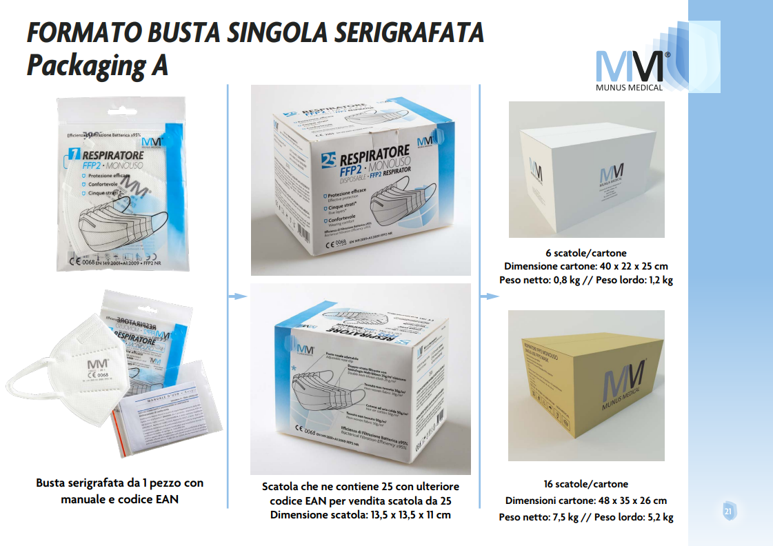 Ogni mascherina è unisex, in taglia unica e impacchettata in busta da 50 pezzi sfusi contenuta in scatola serigrafata o in 5 buste da 10 pezzi ciascuna contenente manuale d’uso sigillato in bustina che lo separa dai dispositivi contenute in scatola serigrafata.