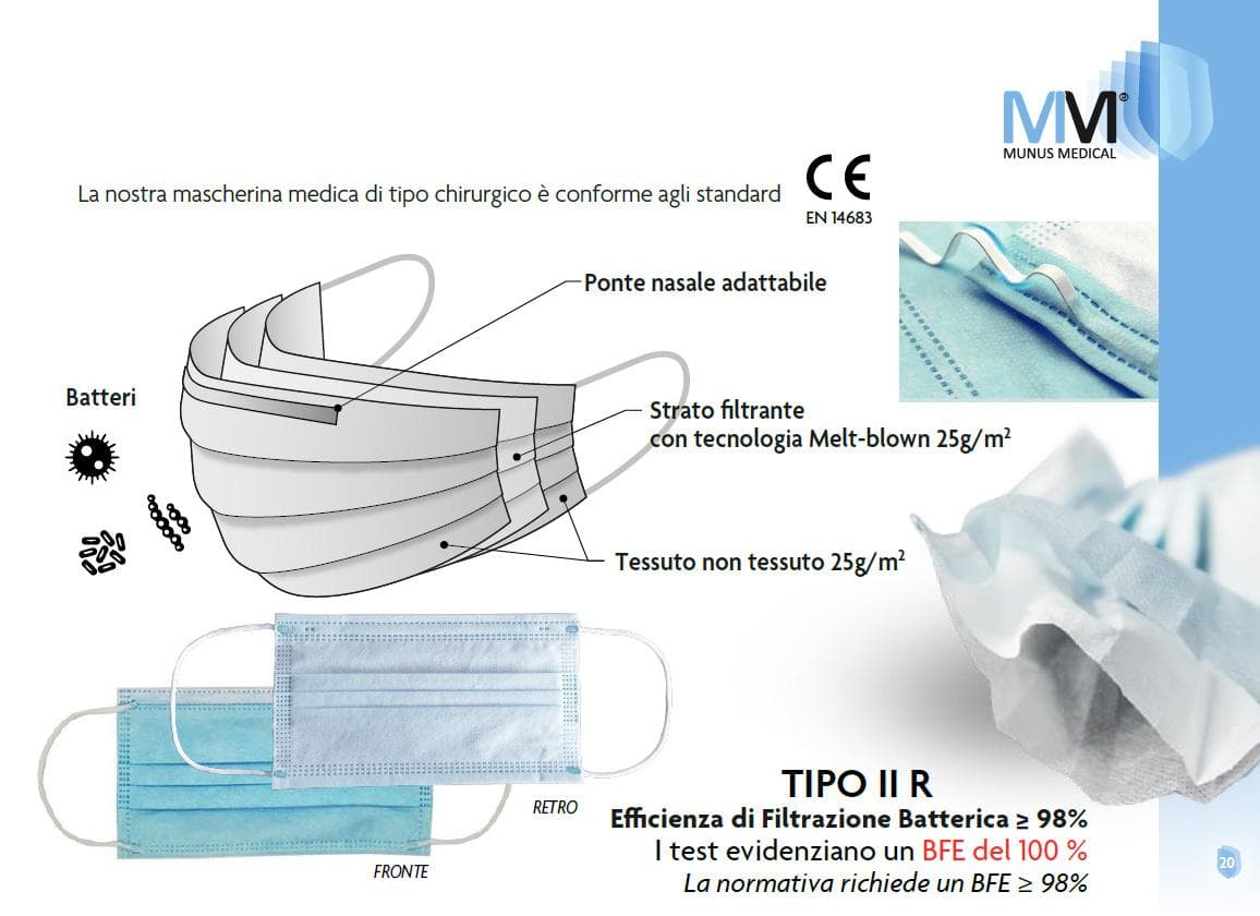 I nostri articoli infatti non sono solo conformi alla EN14683, normativa che riguarda solo requisiti e metodi di prova ma anche a tutte le normative da rispettare obbligatoriamente per questi Dispositivi, ovvero il nostro prodotto è anche conforme a Regolamento (UE) n. 745/2017 Regolamento relativo ai dispositivi medici, Norma IEC 61882:2016, CEI EN 61511-1, UNI CEI EN ISO 15223-1:2017, UNI CEI EN 10993-1:2010, UNI CEI EN 1041:2009, UNI CEI EN 14971:2012. E' possibile scaricare la documentazione al seguente LINK.
