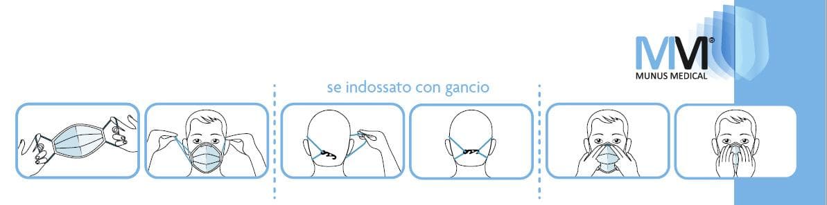 - Indossare la mascherina posizionando uno alla volta gli elastici dietro le orecchie.