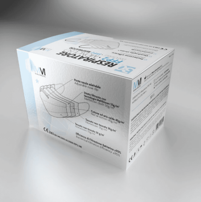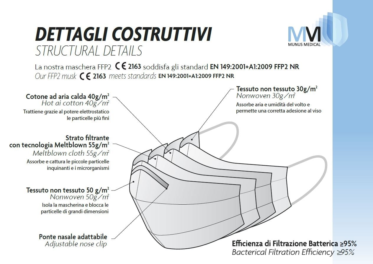 Il dispositivo ha inoltre stampato sul tessuto il logo del fabbricante, il modello, il marchio CE con il numero dell’ente certificatore, le norme di riferimento assieme alla sigla FFP2 NR.
