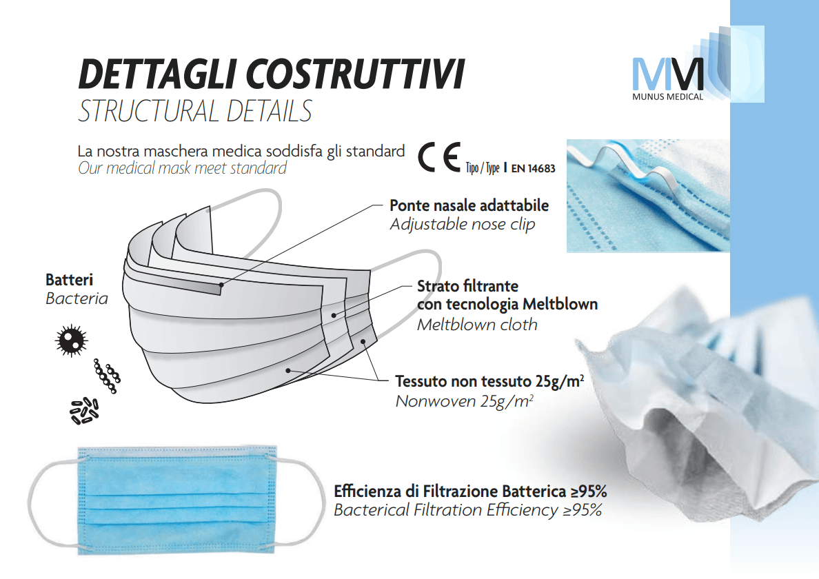 I modelli di mascherina medica MM-001 e MM-002 sono Dispositivi Medici registrati presso il Ministero della Salute seguendo tutte le procedure standard per la corretta produzione, marcatura e distribuzione di questa tipologia di prodotto.